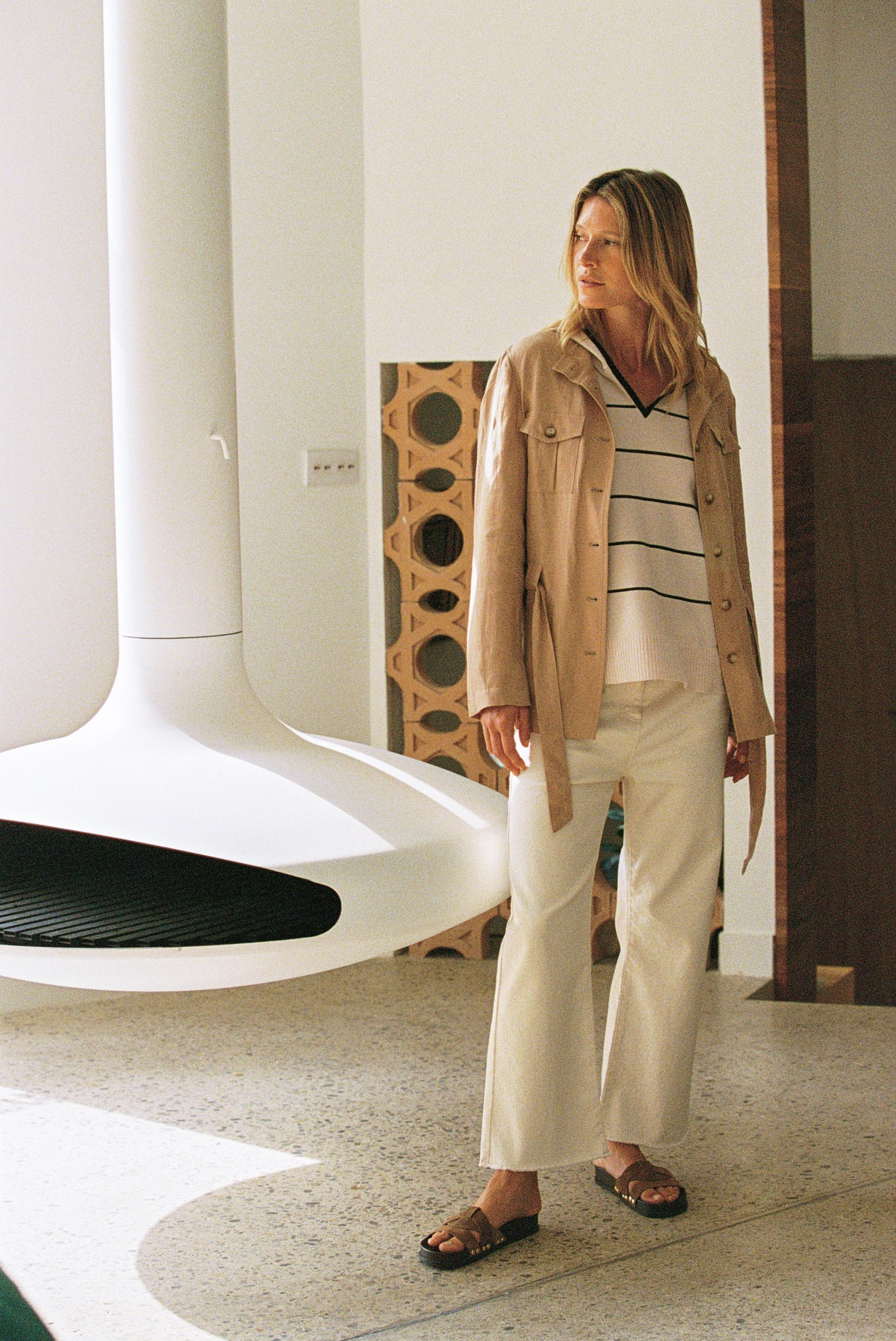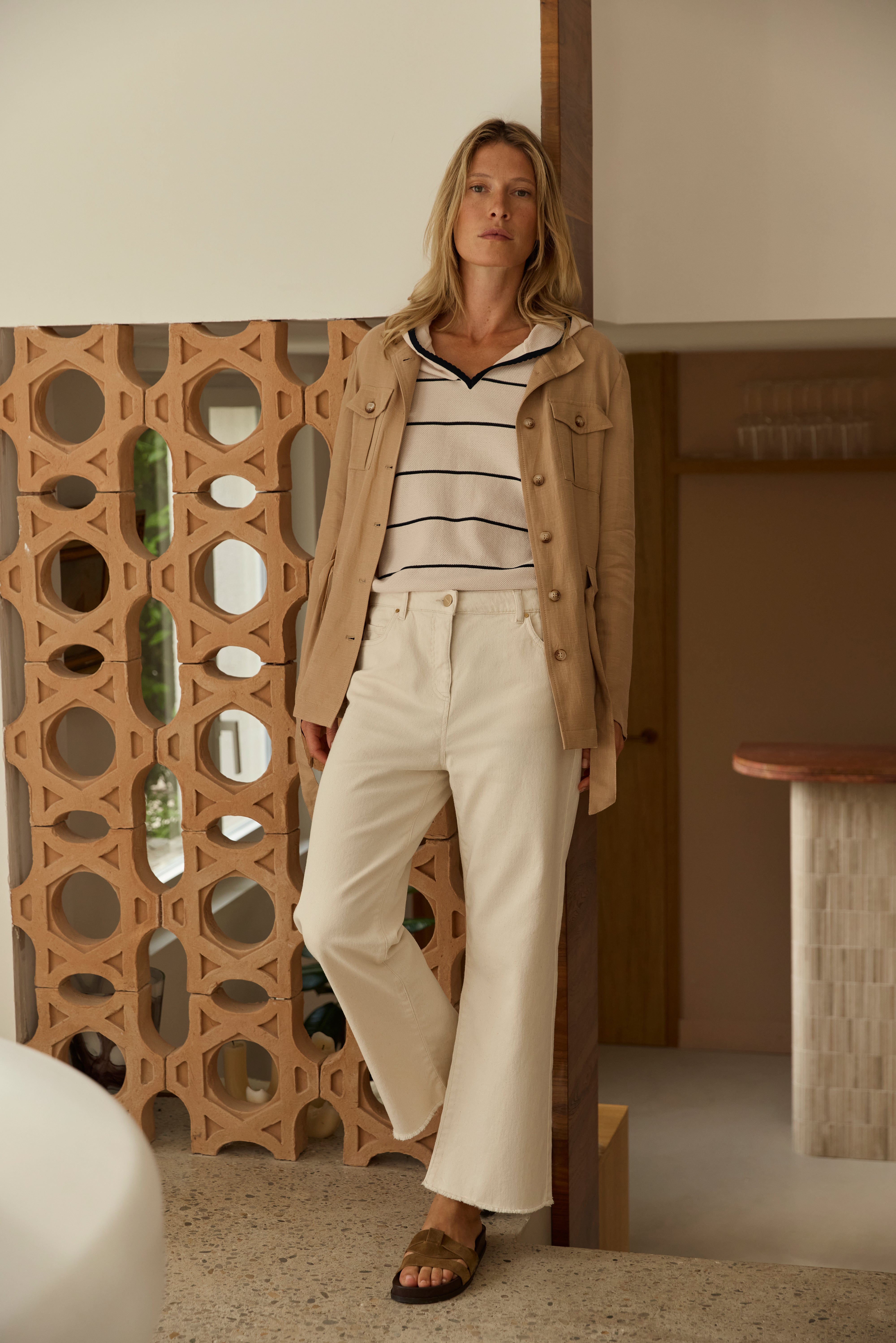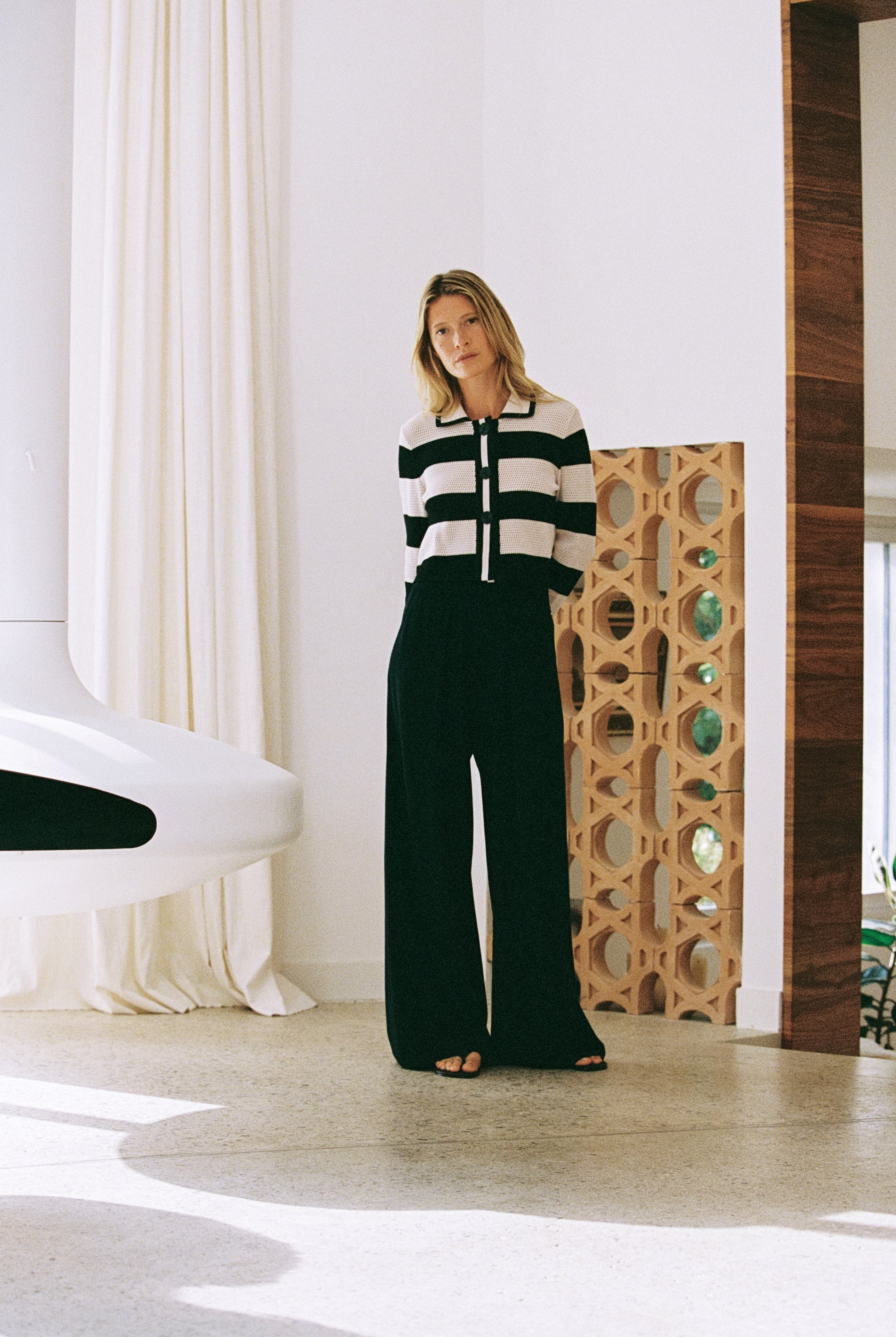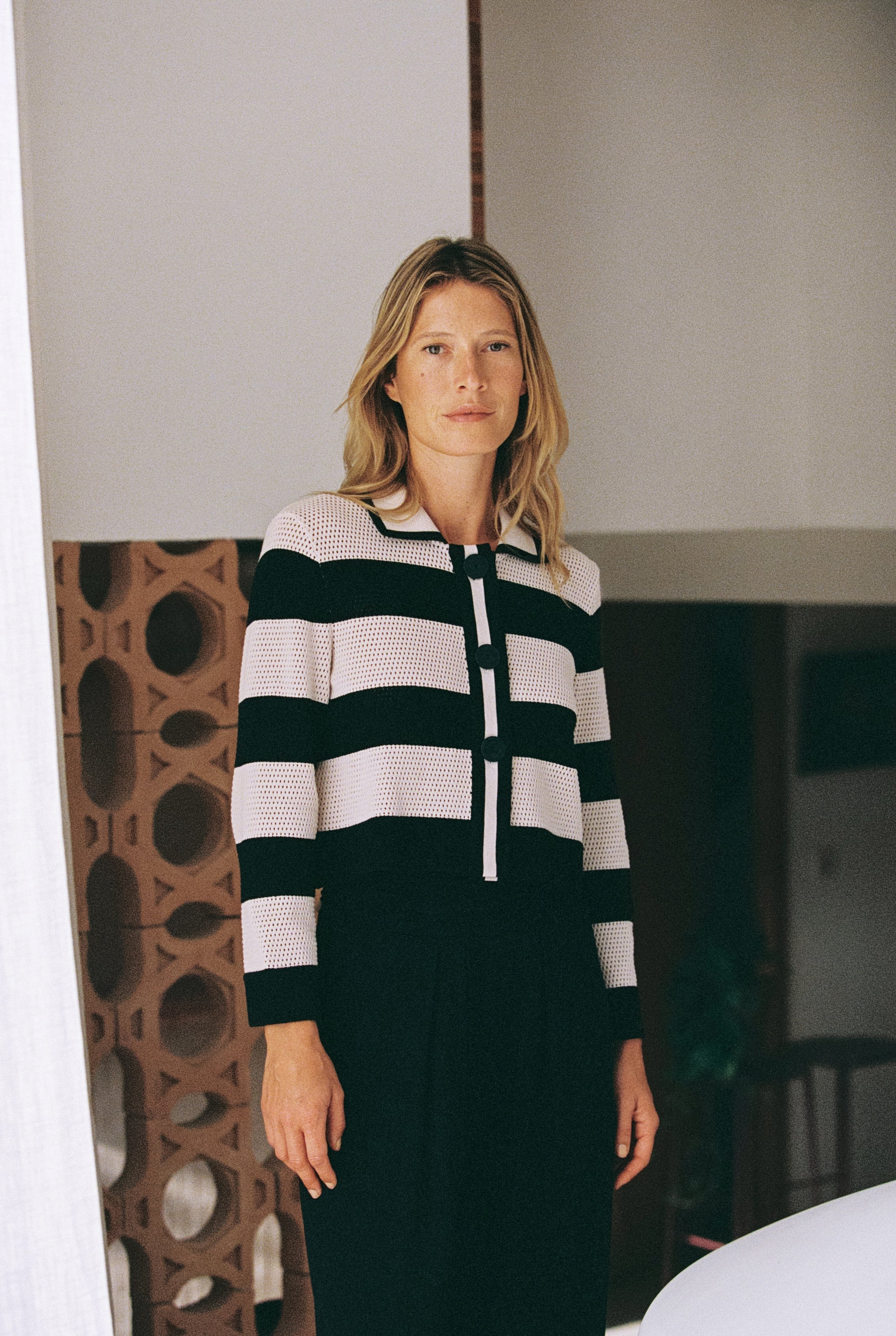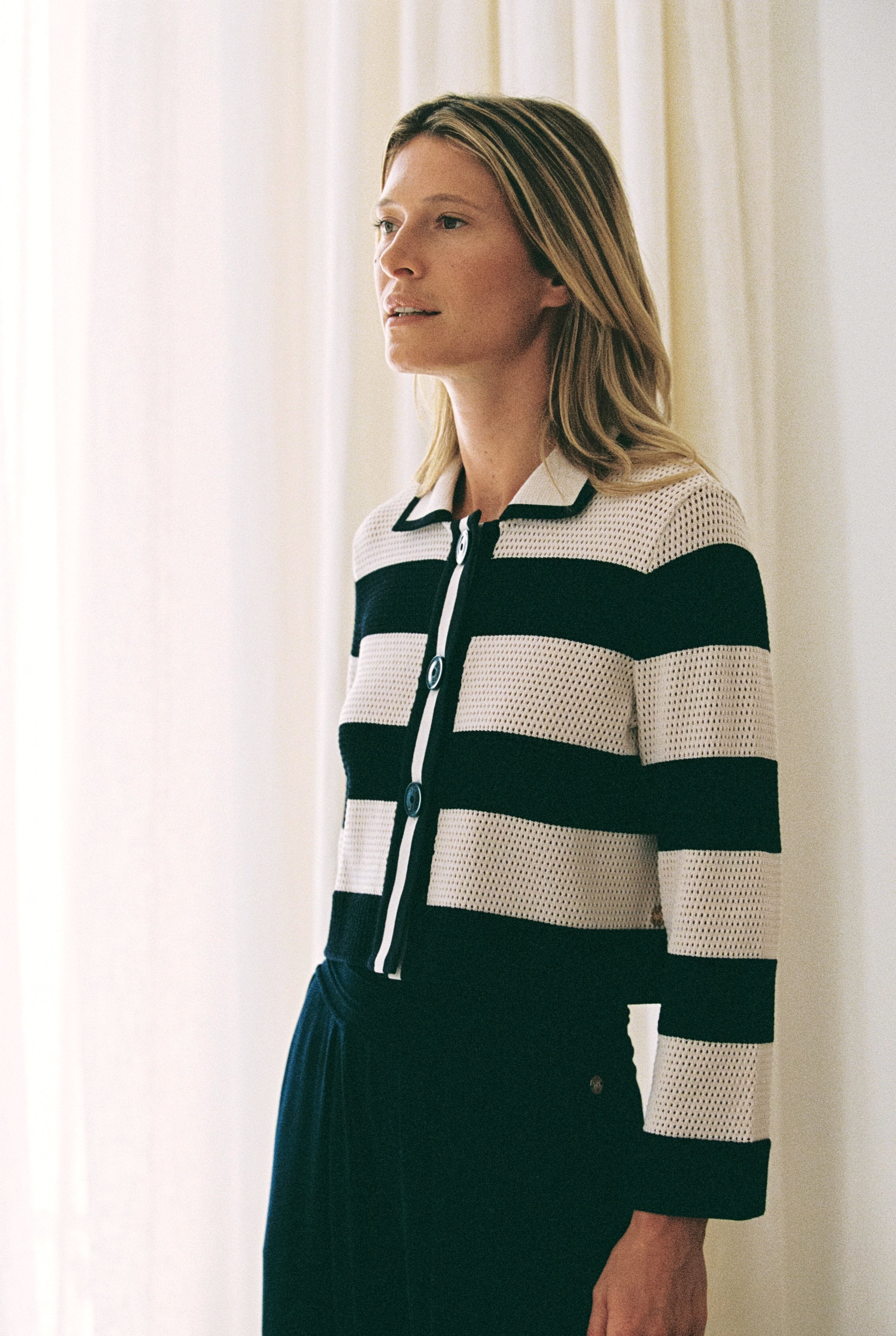 Ses silhouettes sont nettes, aérées, parfaitement tenues : une marinière revisitée glissée dans un pantalon nude, une maille élégante qui suggère un morceau de peau, un col ouvert qui laisse passer la lumière.