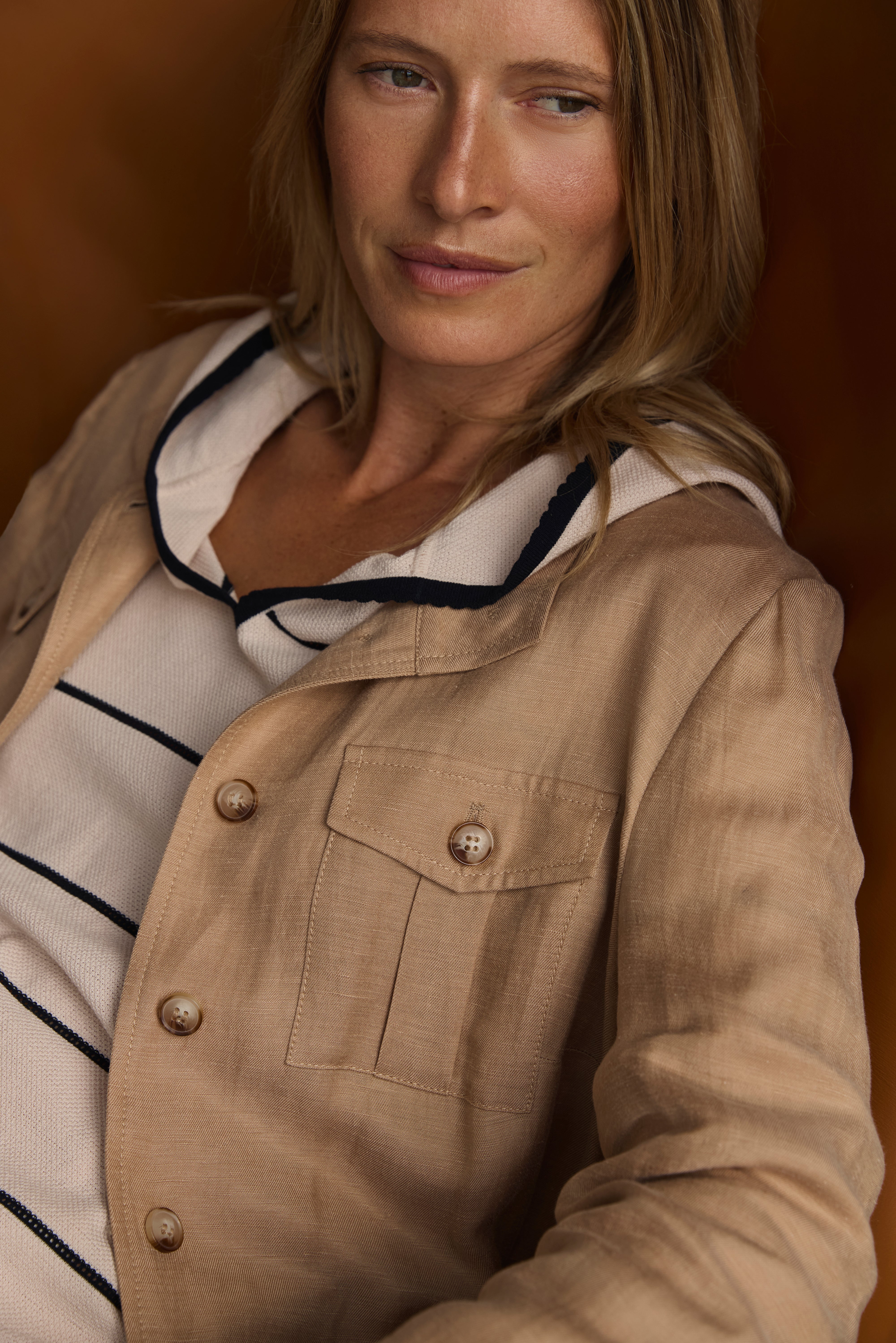À La Baule, son vestiaire respire le bord de mer, se cale sur le rythme de la marée : régulier, précis, apaisé. La femme Devernois emprunte au bord de mer ce qu’il a de plus noble : la ligne. Elle manie les rayures avec subtilité, tandis que les blancs cassés dialoguent avec les bleus nuit comme l’architecture le fait avec l’horizon.