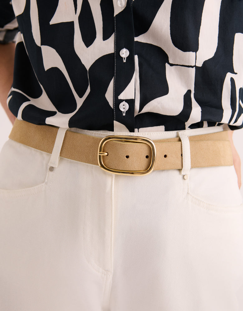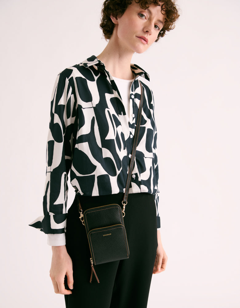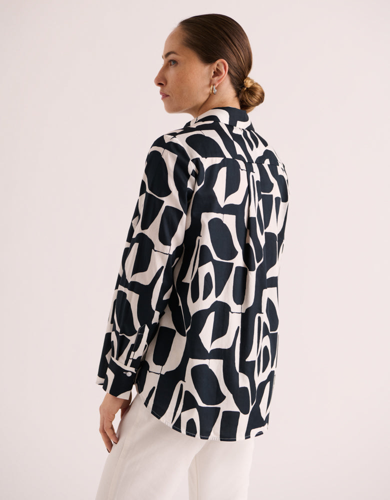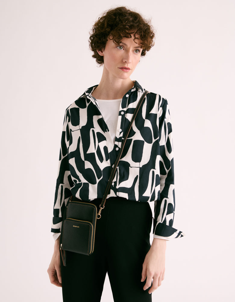 This iconic piece reinvents itself with audacity, combining timeless elegance and an avant-garde touch. In certified cotton poplin , this blouse reveals an airy fluidity , enhanced by an arty print with bohemian accents . The long sleeves bring a feminine touch, while the buttoned side slits instill a resolutely modern spirit. The rounded liquette base gracefully emphasizes the waist, giving the silhouette a liberated look.