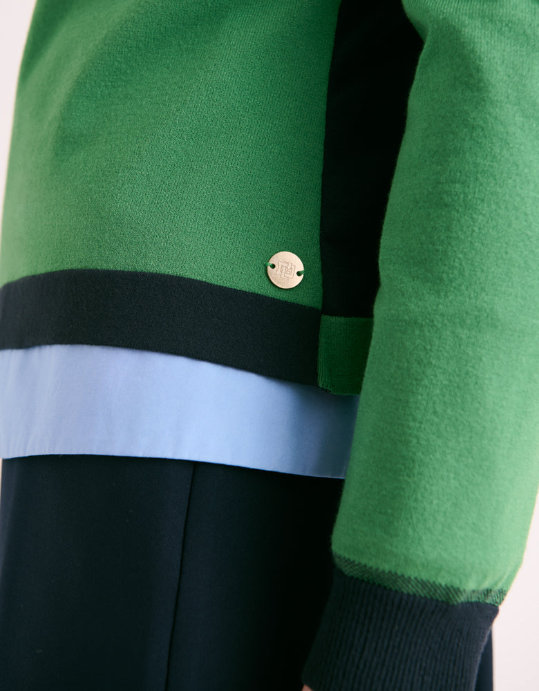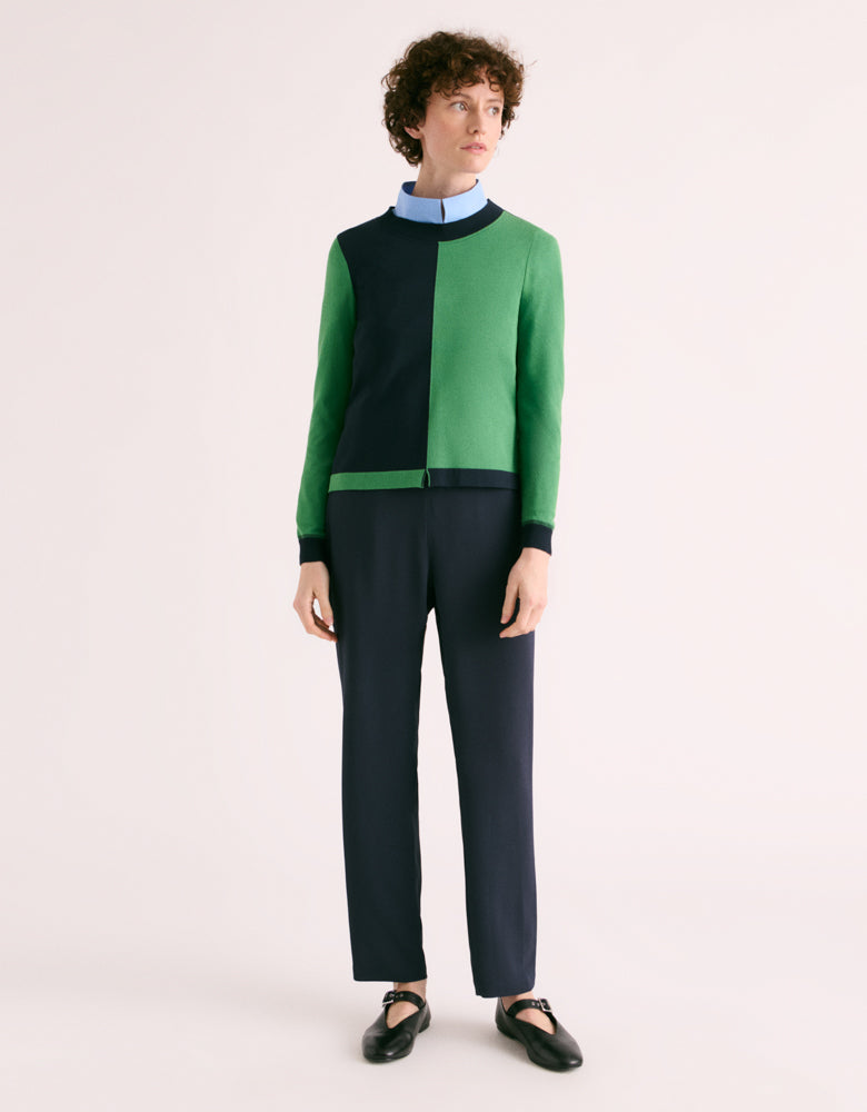 Its straight cut and round neckline create a clean silhouette, while the striking contrast between green and navy creates a unique visual impact. Neither too formal nor too casual, this sweater skillfully navigates between casual and classic chic, adapting to your style with natural versatility. It is the essence of reinvented style, a piece of history that is part of the present, combining the authenticity of know-how with a modern aesthetic.