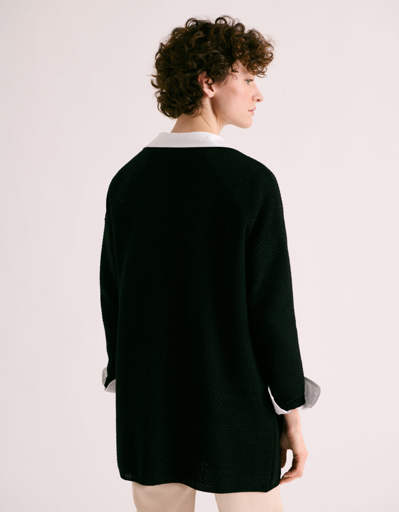 Knitted in our historic workshops in France , this jacket embodies timeless elegance. Its round neckline and slightly dropped shoulders give it a casual and feminine look. Enhanced with two patch pockets for a practical side, its refined cut remains nonetheless sophisticated.