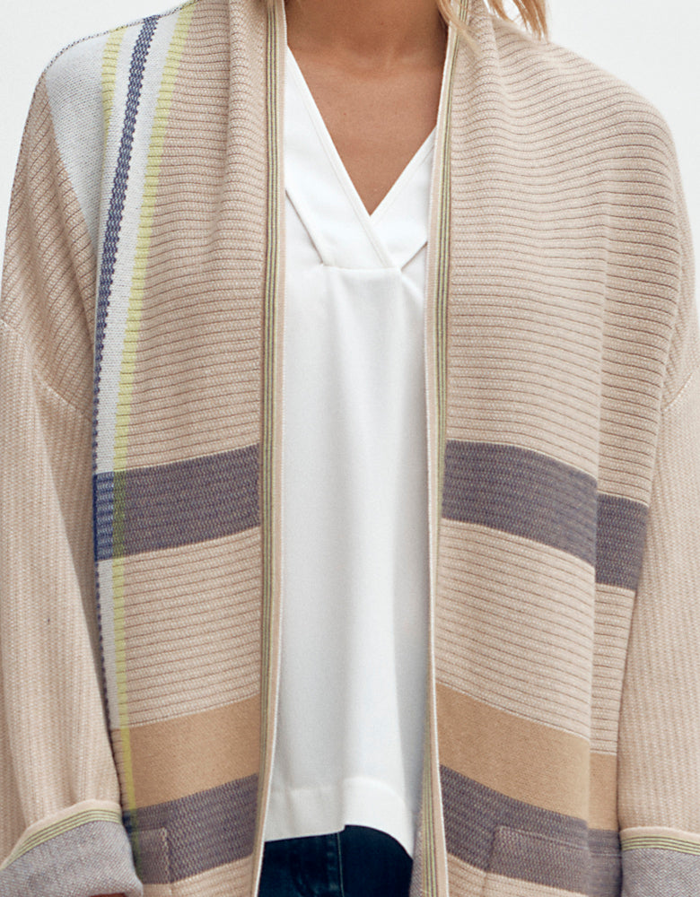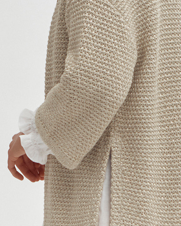 El jacquard se distingue por el entrelazamiento de puntos durante el tejido, creando un diseño, visible en el lado derecho y en el reverso del tejido, al revés. Este proceso ofrece múltiples posibilidades de estampados, desde los más tradicionales hasta los más modernos, como los tejidos jacquard de nuestras colecciones. Es un tejido que nos es muy querido, ya que está en el origen del éxito de nuestra Casa desde los años 30, con la creación de los jerseys de jacquard para hombre.