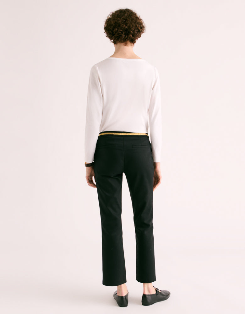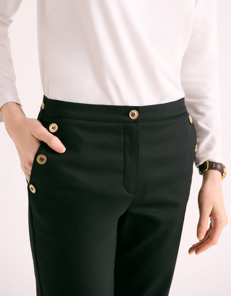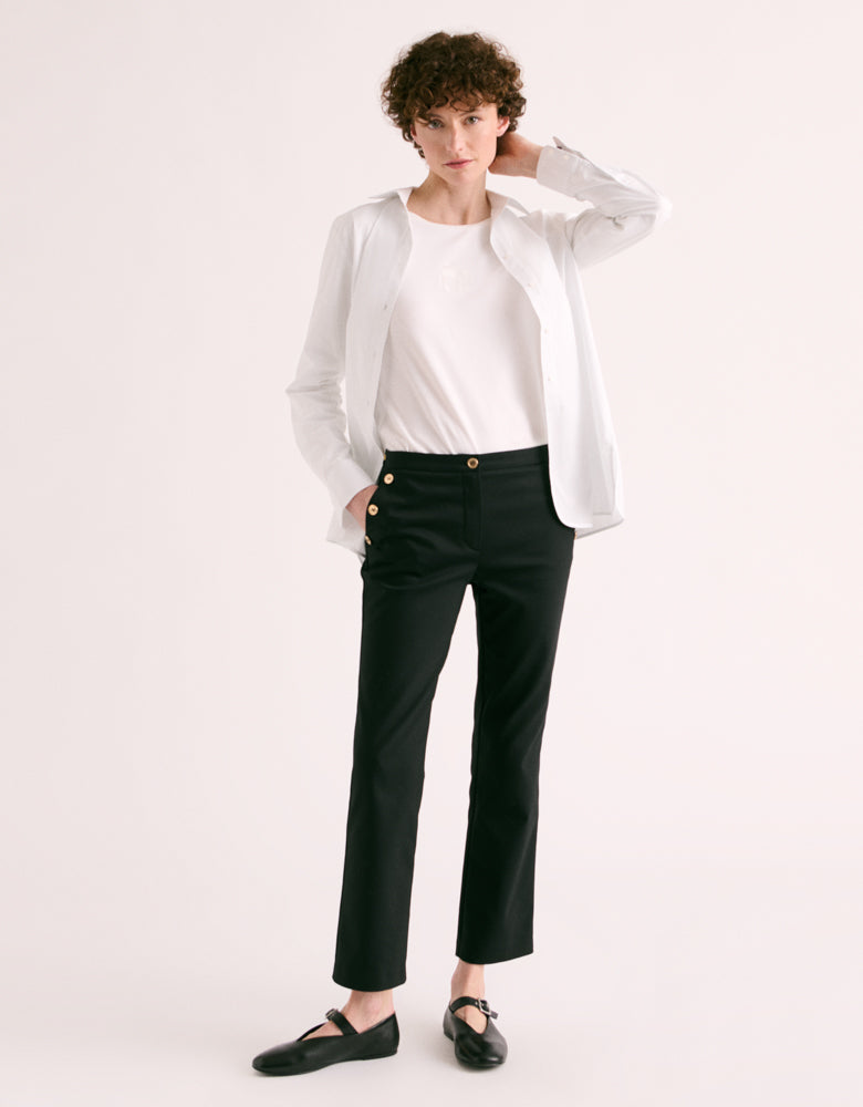 Los bolsillos italianos ocultos combinan un aspecto limpio con practicidad, mientras que el ribete falso en la parte posterior añade un toque sutil de carácter. La longitud de las piernas de 7/8 , realzada con aberturas laterales , deja ver sutilmente los tobillos.