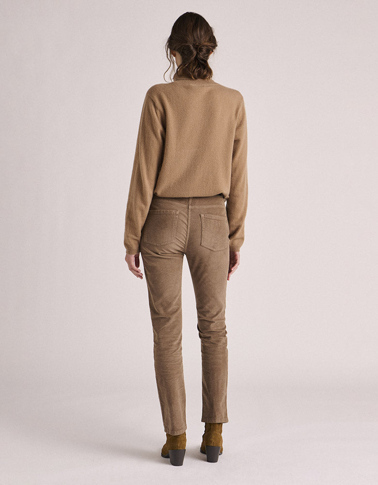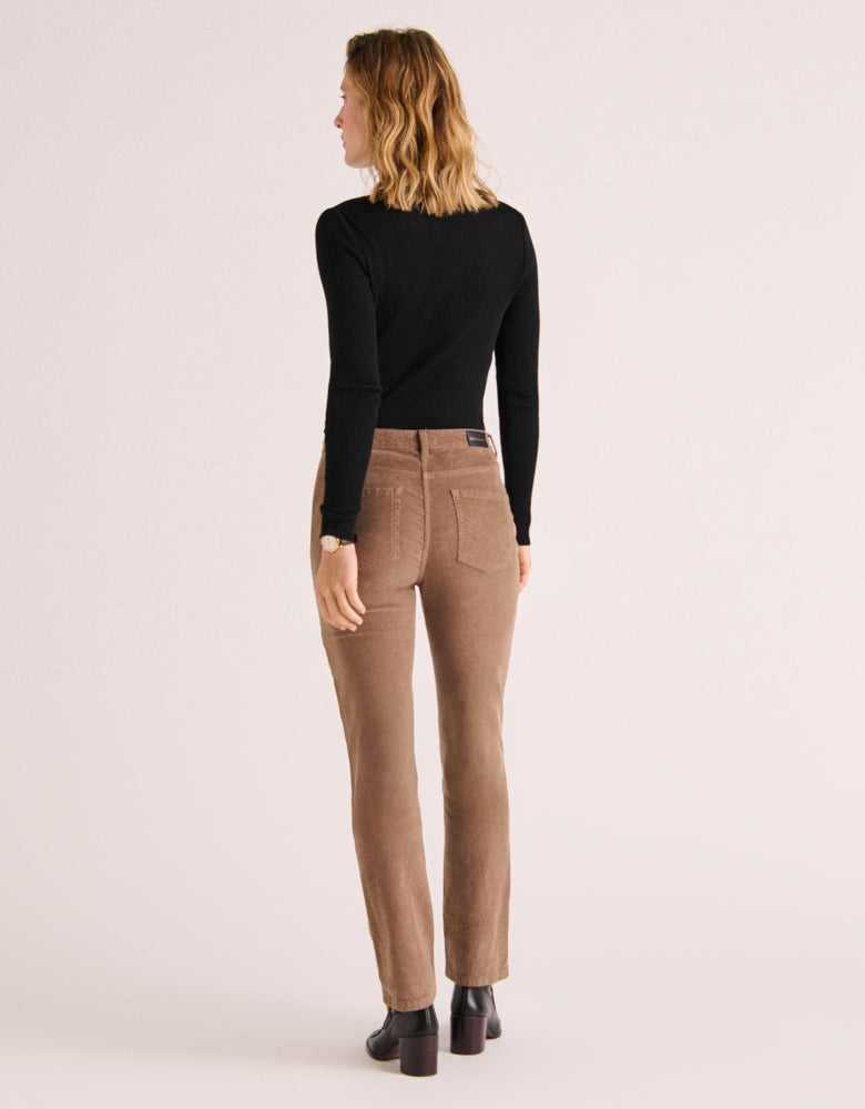 El terciopelo milleraies se reinventa en estos pantalones rectos que combinan funcionalidad y sobriedad. Sus cinco bolsillos ofrecen practicidad sin renunciar a la estética, mientras que su color neutro se adapta al espíritu de los tiempos sin dejar de ser atemporal.