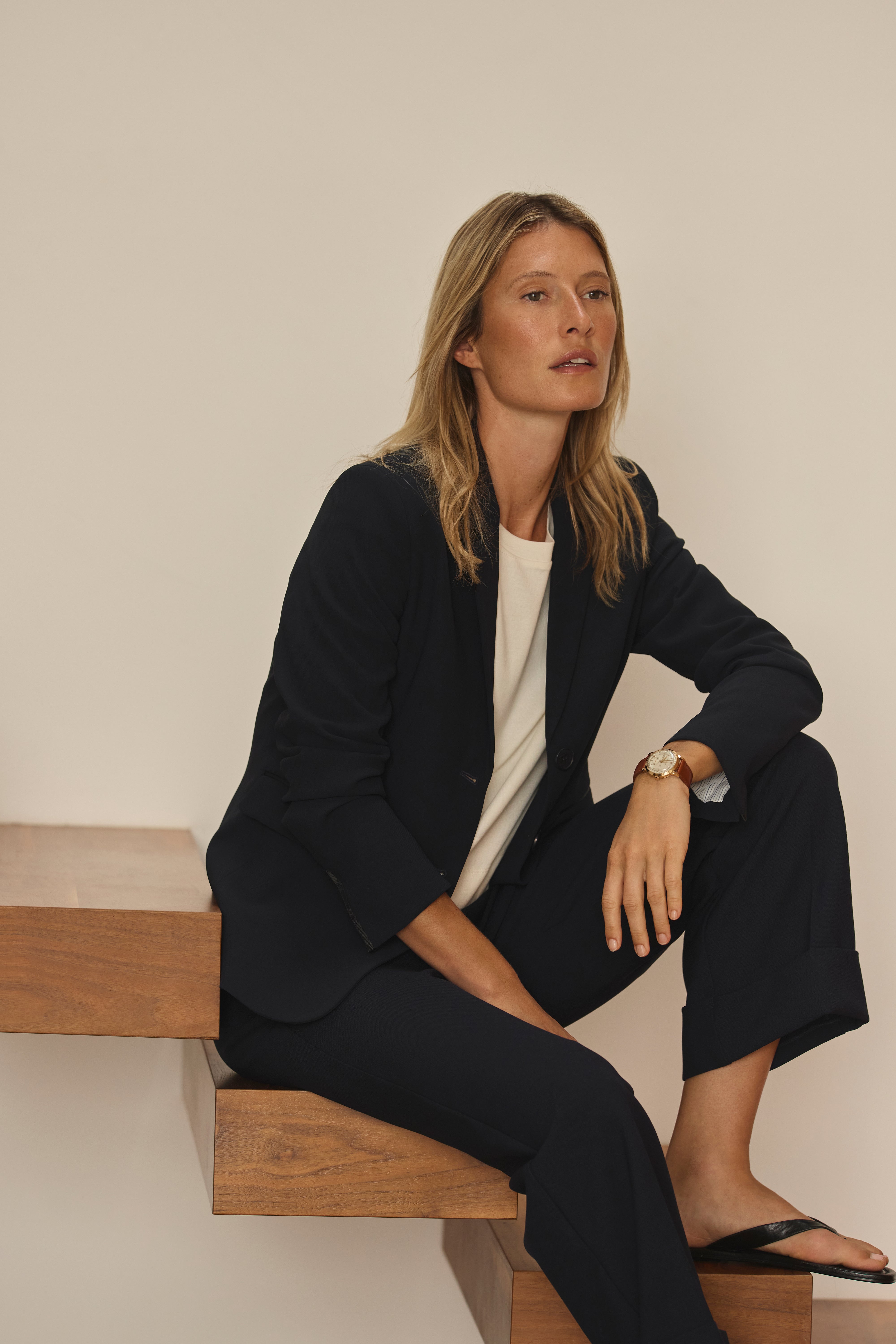 À La Baule, son vestiaire respire le bord de mer, se cale sur le rythme de la marée : régulier, précis, apaisé. La femme Devernois emprunte au bord de mer ce qu’il a de plus noble : la ligne. Elle manie les rayures avec subtilité, tandis que les blancs cassés dialoguent avec les bleus nuit comme l’architecture le fait avec l’horizon.