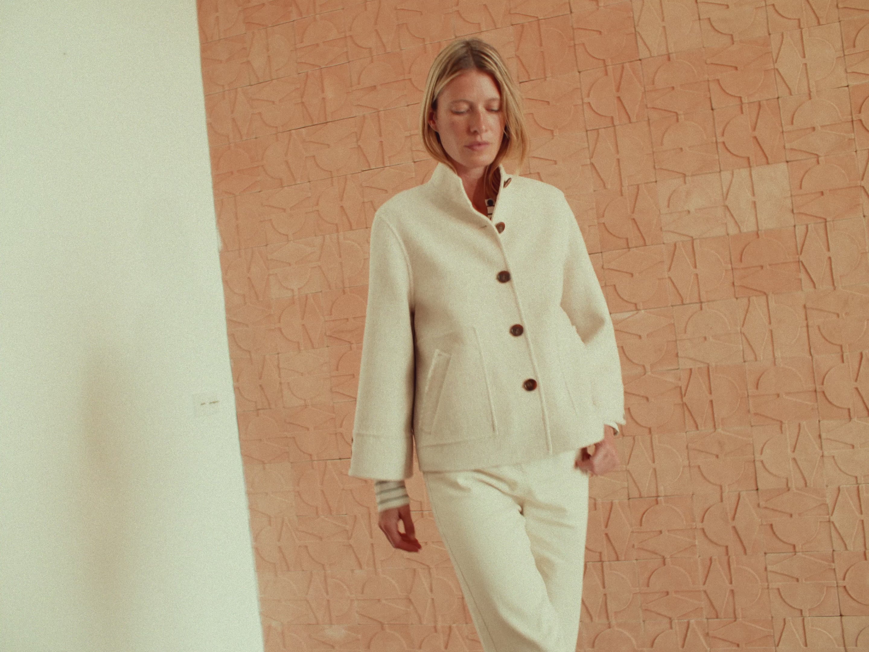 Les premiers jours encore frais appellent des mailles souples, enveloppantes, couches de douceur. Portées ouvertes, superposées avec justesse, elles dessinent une silhouette qui ne cherche jamais l’effet, mais toujours l’allure. Le marine affirme la ligne, le framboise ponctue l’allure comme une note de spontanéité : la femme Devernois ose, mais toujours avec subtilité.