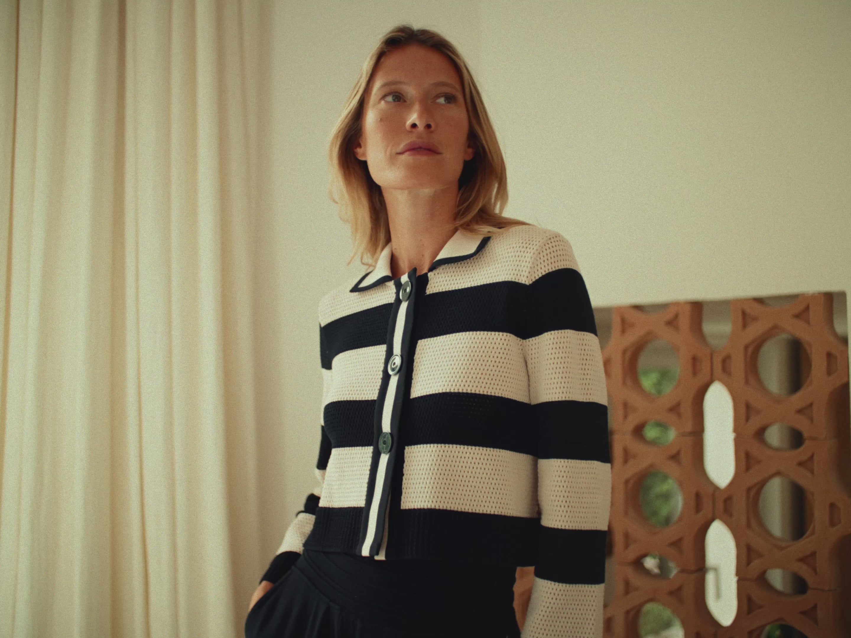 Ses silhouettes sont nettes, aérées, parfaitement tenues : une marinière revisitée glissée dans un pantalon nude, une maille élégante qui suggère un morceau de peau, un col ouvert qui laisse passer la lumière.