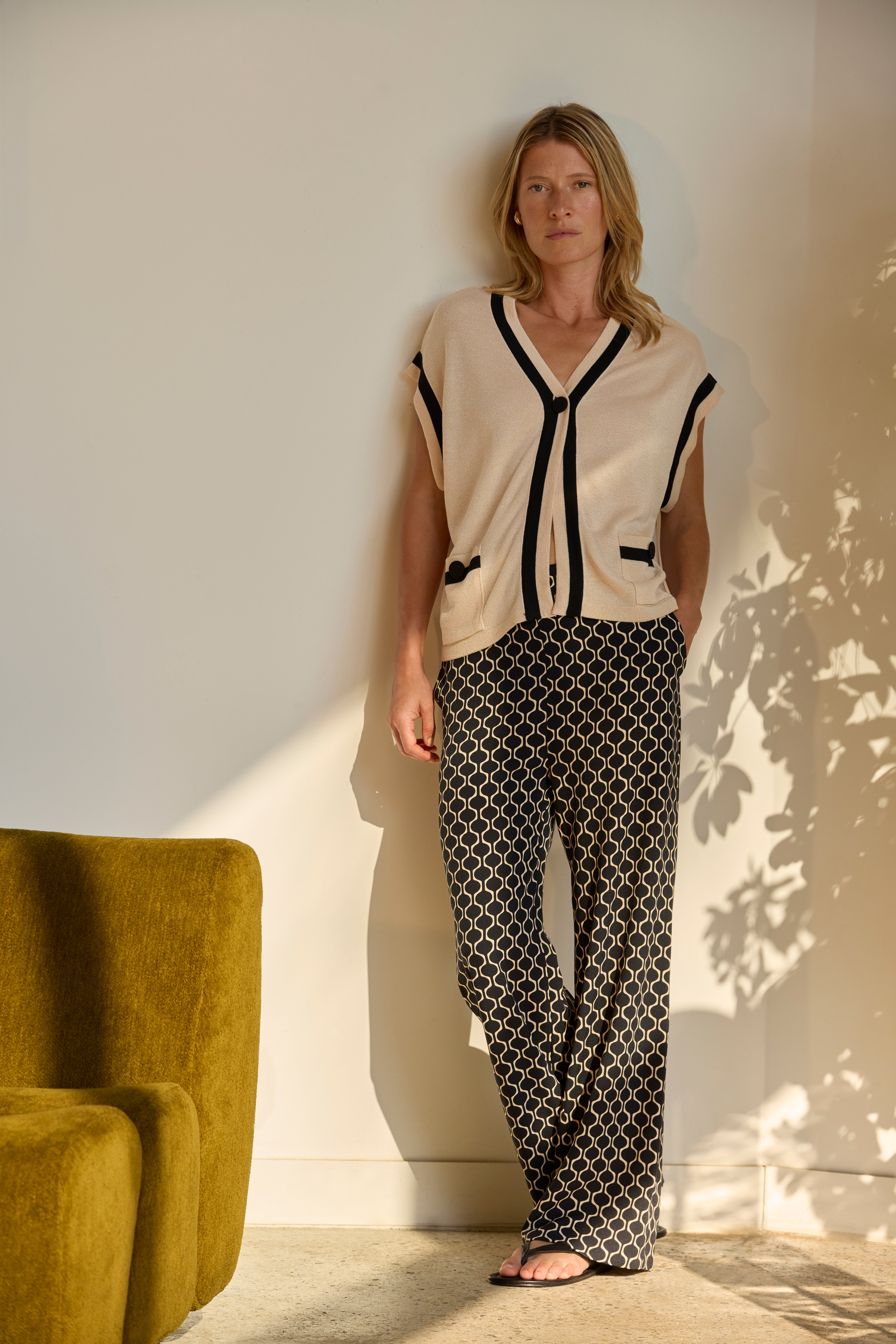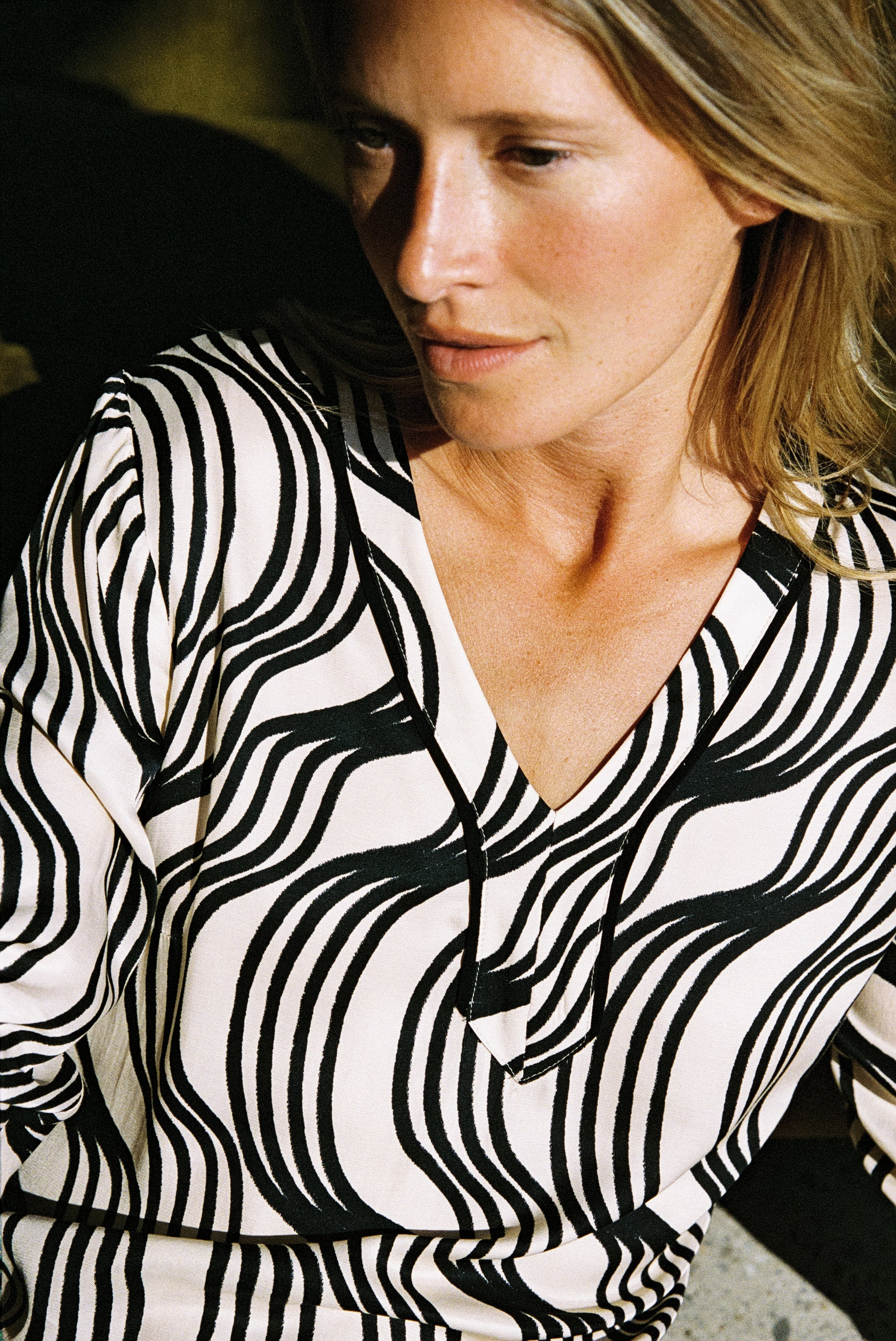 Elle opte pour des coupes longues, des volumes souples : une robe fluide qui glisse sur le corps, un pantalon large accompagné d’une tunique au dessin arty, un top nude qui se fond dans un bas noir. Son allure est calme, posée, mais chargée d’une intensité silencieuse.