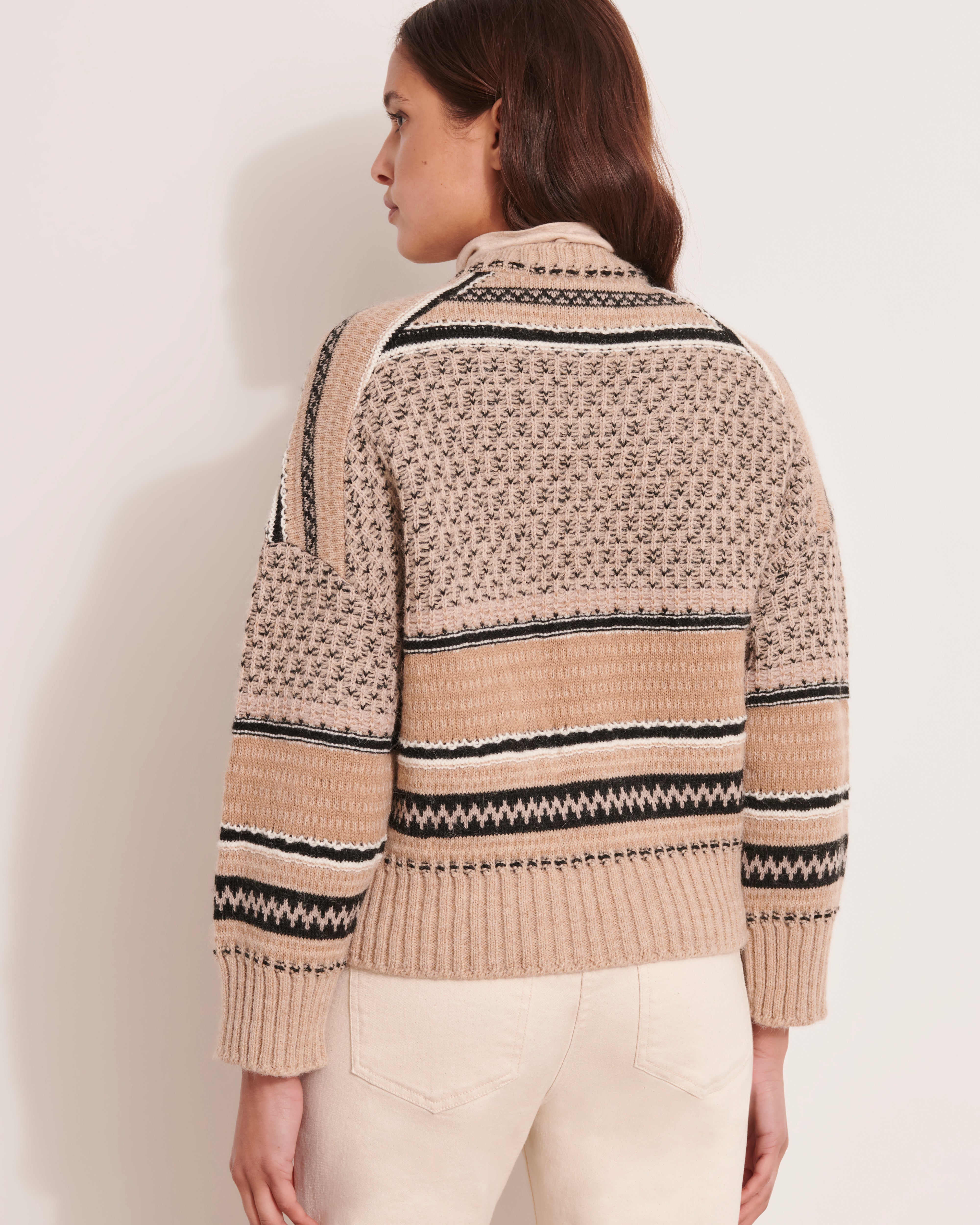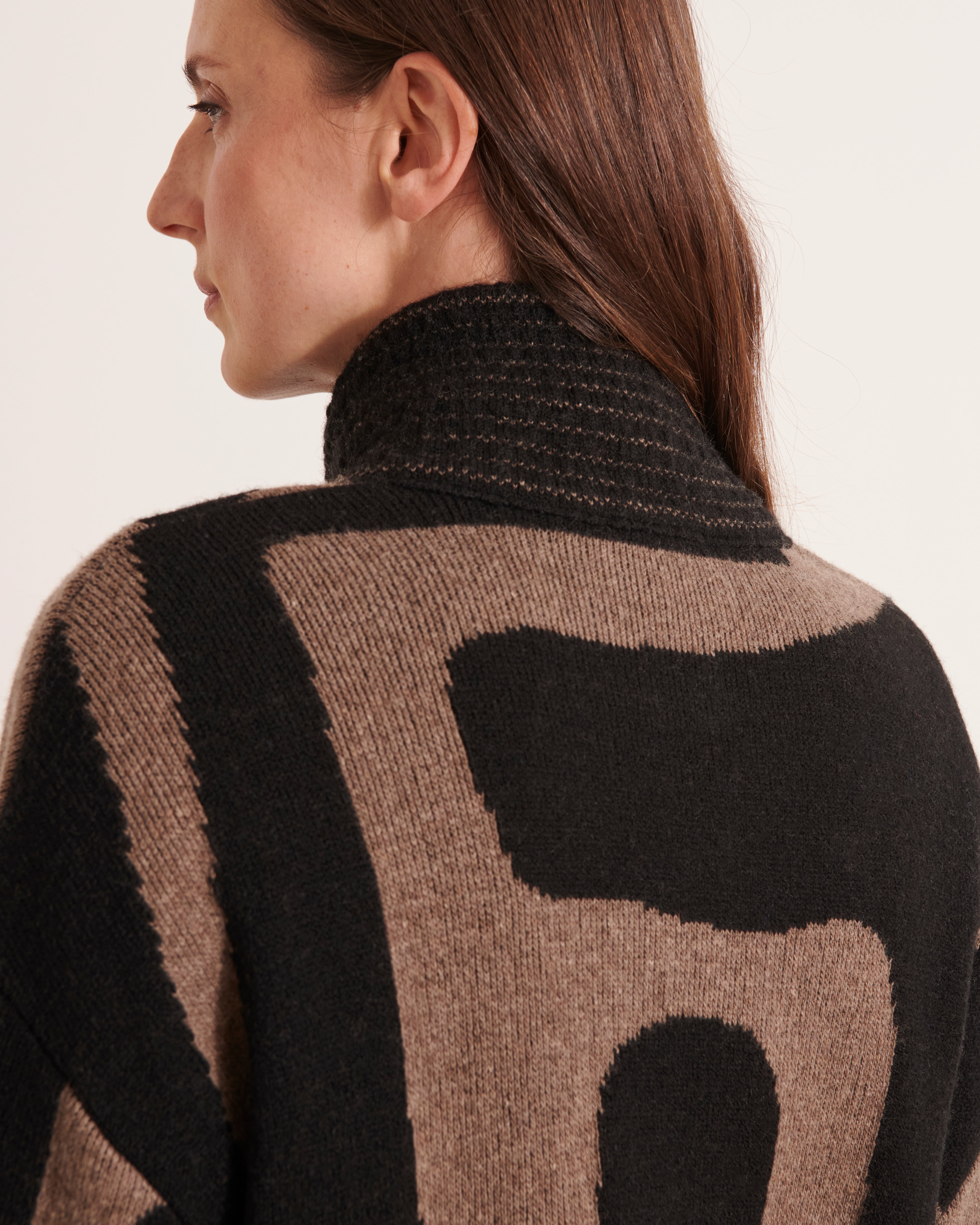 Dans l’air du quiet luxury, ce vestiaire cultive l’art du peu, le goût du beau, le choix du juste. Des teintes sourdes, des associations subtiles, un style feutré, mais toujours incarné. la femme Devernois entre dans l’hiver, emmitouflée dans des mailles généreuses, des pulls doudous en laine ou cachemire, et des manteaux à la douceur assumée. Puis vient la rupture maîtrisée : un imprimé graphique, des maxi chevrons sur une viscose fluide. Le motif impose le rythme, donne à l’ensemble une respiration contemporaine. Et dans ce décor, le cardigan signe son grand retour. Classique devenu essentiel, il joue les caméléons : sur une chemise blanche, une robe fluide ou un pantalon droit, il dessine les contours d’une féminité assumée, moderne, naturelle.