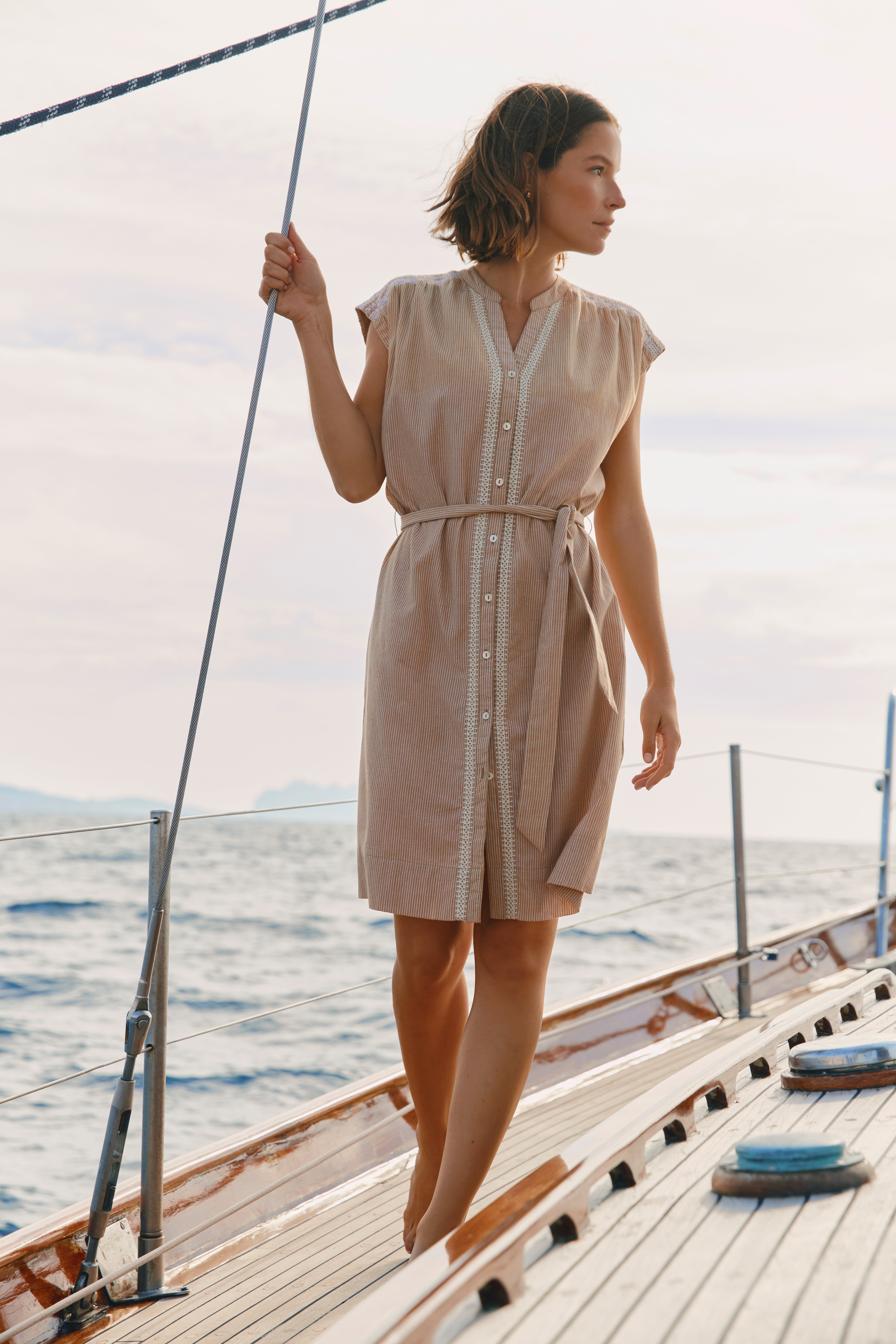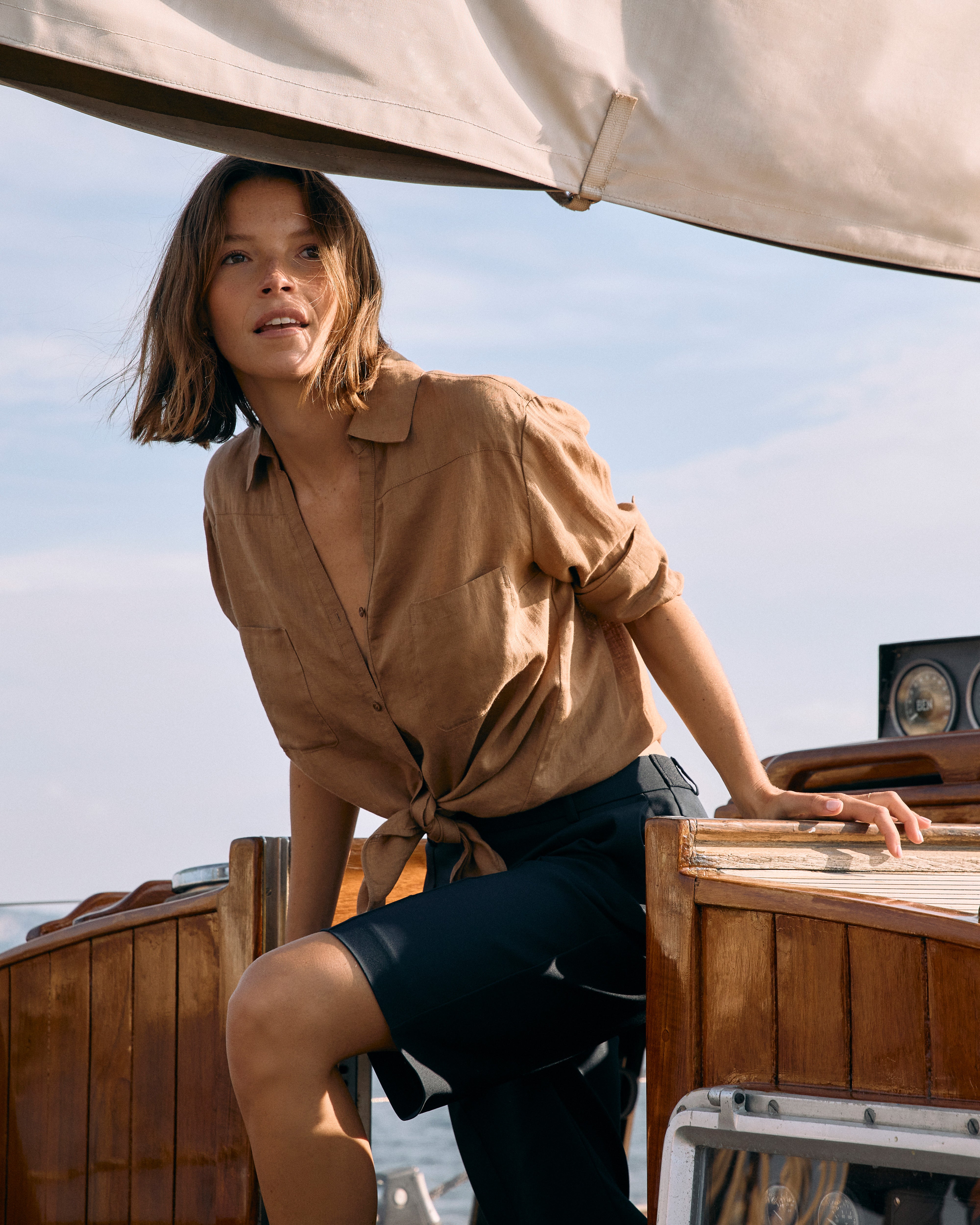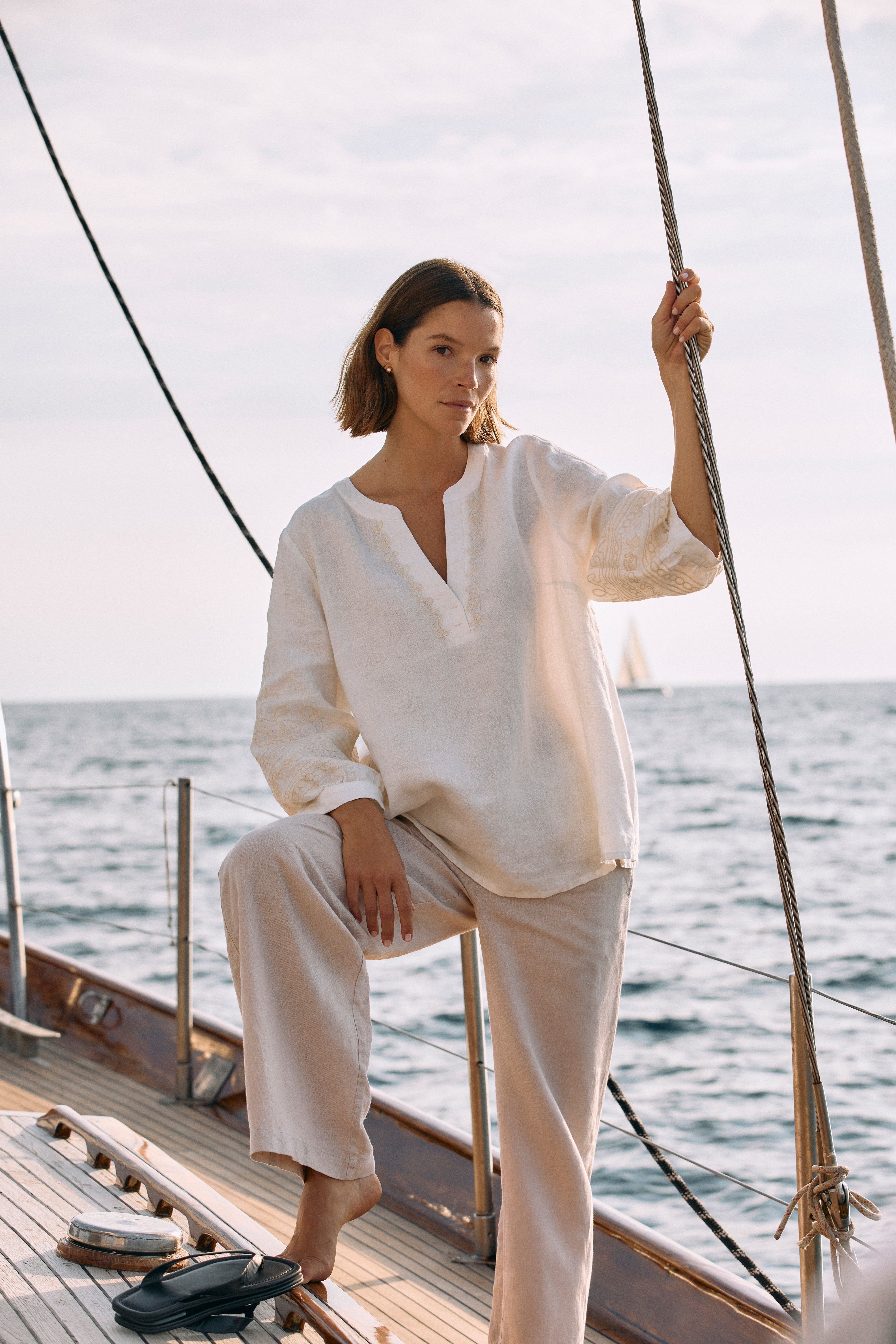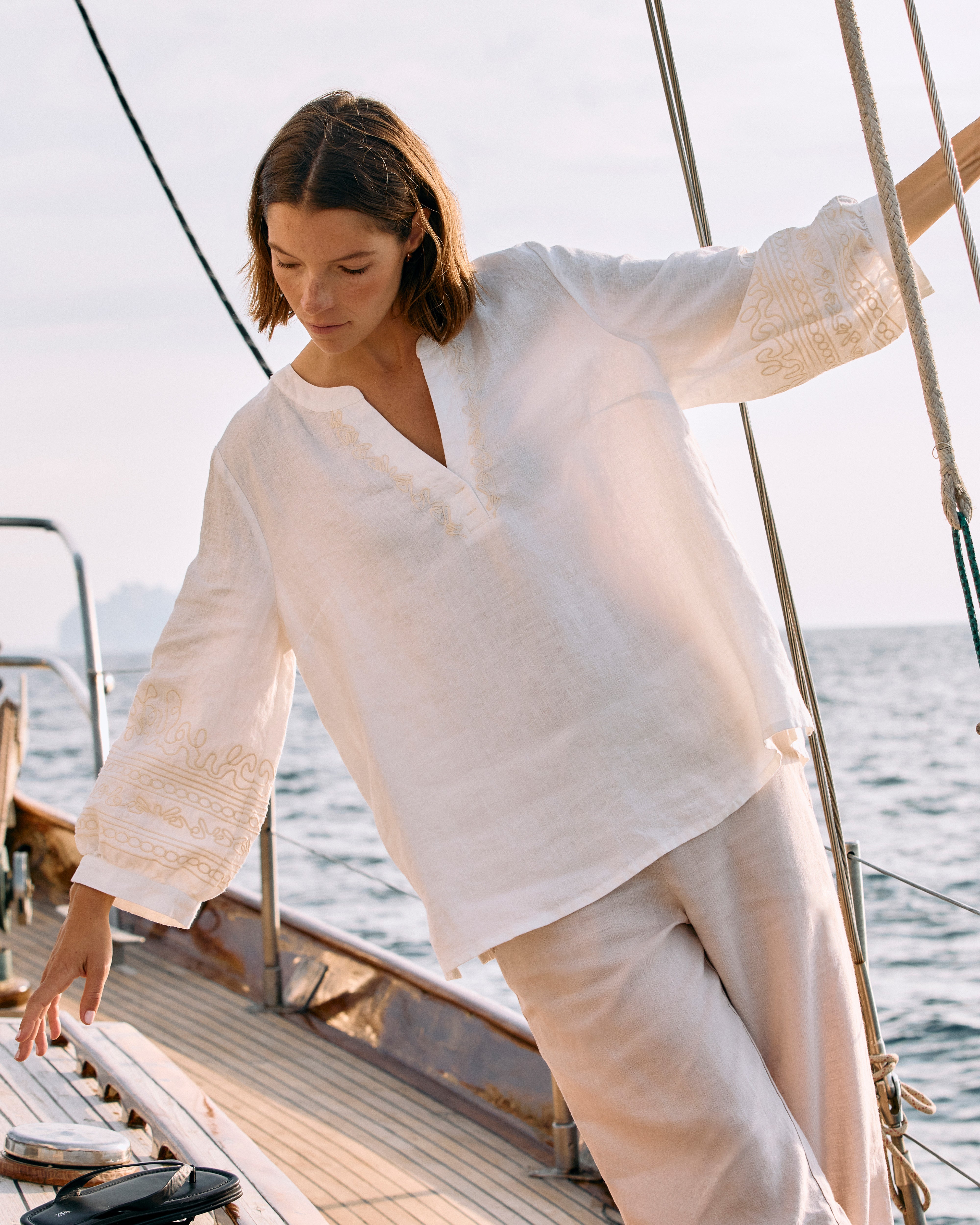 La femme Devernois se plaît dans les coupes pures : une tunique en lin légère qui flotte autour d’elle, une jupe claire qui danse au moindre souffle, un top pastel qu’elle glisse sous une maille ajourée.