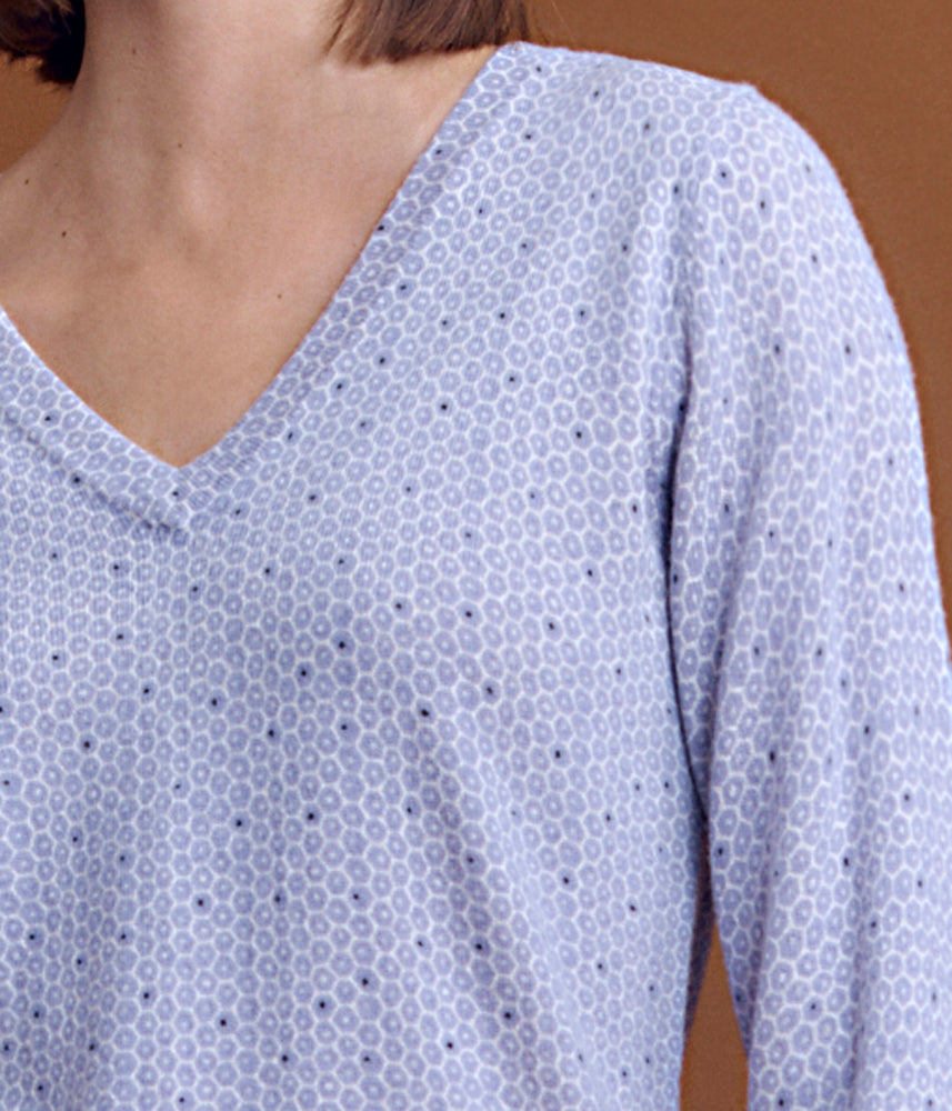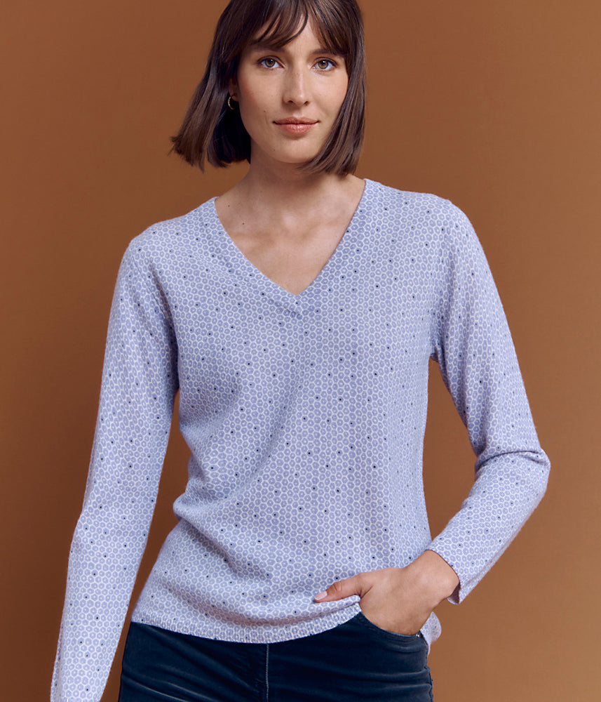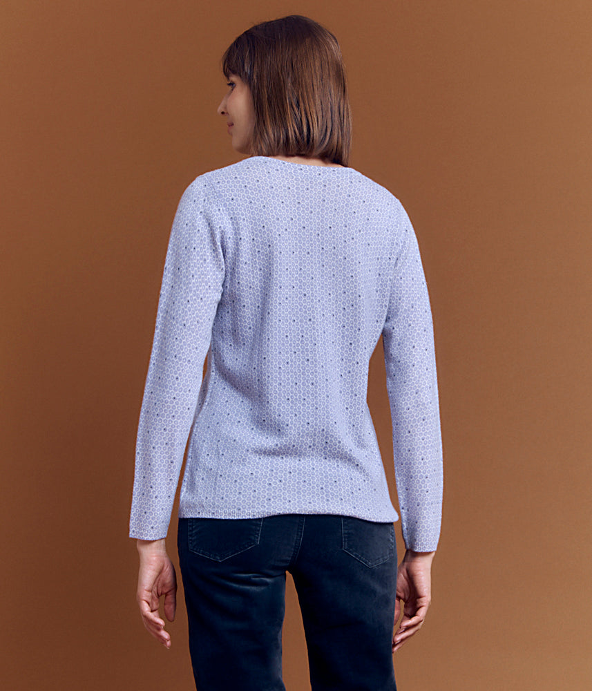 REF: ALVEOLE/84142/891/0 Pull imprimé à col V.- Encolure V- En laine et cachemire - Manches longues - Imprimé géométrique style alvéoles