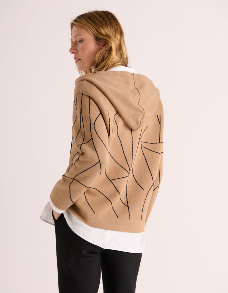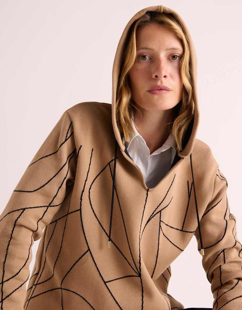 Sa silhouette épurée se pare d'un jacquard aux lignes contrastantes, jouant sur une palette de camel chaleureux et de noir profond. L'encolure en V et la capuche apportent une touche streetwear à ce best-seller de nos collections. Du fil à la finition, chaque étape de sa confection s'ancre dans un territoire et un héritage. Sans ostentation, il porte en lui l'empreinte du made in France et l'expertise de nos artisans.